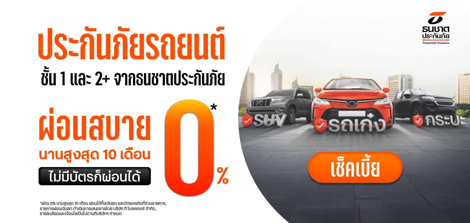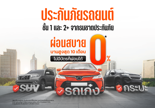 ประกันภัยรถยนต์ชั้น 1 และ 2+ ผ่อนสบาย 0% สูงสุด 10 เดือน พร้อมบริการช่วยเหลือฉุกเฉิน 24 ชม.