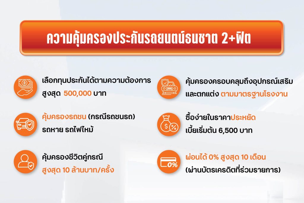 ประกันภัยรถยนต์ ธนชาต 2+ฟิต คือทางเลือกที่พอดีกับรถของคุณ ด้วยจุดเด่นของผลิตภัณฑ์ที่ให้ความคุ้มครองอย่างครบถ้วนและบริการอื่นๆ อีกมากมายที่พร้อมมอบความสะดวกสบาย ครอบคลุมกับความเสี่ยงที่คุณต้องเจอบนท้องถนน ตอบโจทย์พอดีกับความจำเป็นให้กับลูกค้า