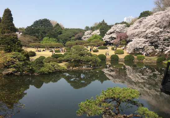 สานชินจูกุเกียวเอนเป็นสวนสาธารณะขนาดใหญ่ใจกลางชินจูกุที่ผสมผสานระหว่างสวนในสไตล์ญี่ปุ่น และสวนสไตล์ตะวันตก มีซากุระมากกว่า 1,500 ต้น ทำให้สามารถชมดอกซากุระได้นานกว่าจุดอื่น ๆ เนื่องจากมีต้นซากุระหลากสายพันธุ์ที่บานในช่วงเวลาที่แตกต่างกัน