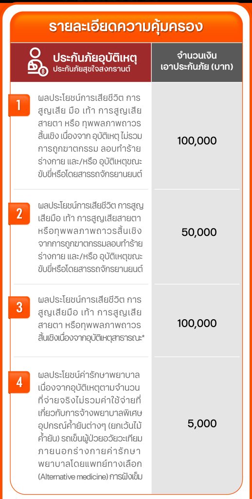 - สำหรับประกันภัยอุบัติเหตุส่วนบุคคล แจ้งอุบัติเหตุที่หมายเลข 02-308-9300 ต่อ 2897 จันทร์-ศุกร์ เวลา 8.30- 17.00 น.