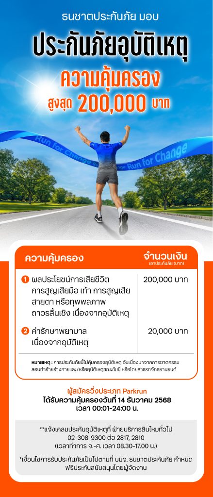 ธนชาตประกันภัย มอบประกันภัยอุบัติเหตุส่วนบุคคลสำหรับผู้สมัครในโครงการ ttb | Thanachart Insurance parkrun 2025 ประเภท Parkrun ให้ความคุ้มครองในวันที่ 14 ธันวาคม 2568