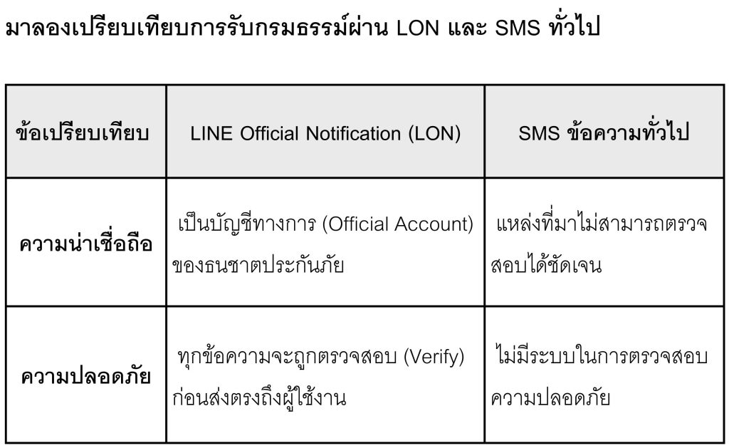 LINE Official Notification (LON) เป็นบริการจาก LINE Thailand ที่ช่วยจัดส่งข้อความ หรือเอกสารผ่านทางอิเล็กทรอนิกส์ซึ่งมีมาตรฐานความปลอดภัยสูง โดยธนชาตประกันภัยได้นำบริการนี้มาใช้สำหรับการจัดส่งกรมธรรม์อิเล็กทรอนิกส์ (E-policy) ให้กับลูกค้าผ่านบัญชี LINE Official Account ทางการของ “ธนชาตประกันภัย” แทนการส่งในรูปแบบลิงก์ผ่าน SMS ทำให้มั่นใจได้ว่าข้อความจะมีความปลอดภัย น่าเชื่อถือ และหมดกังวลเรื่องการถูกปลอมแปลงข้อความจากมิจฉาชีพ